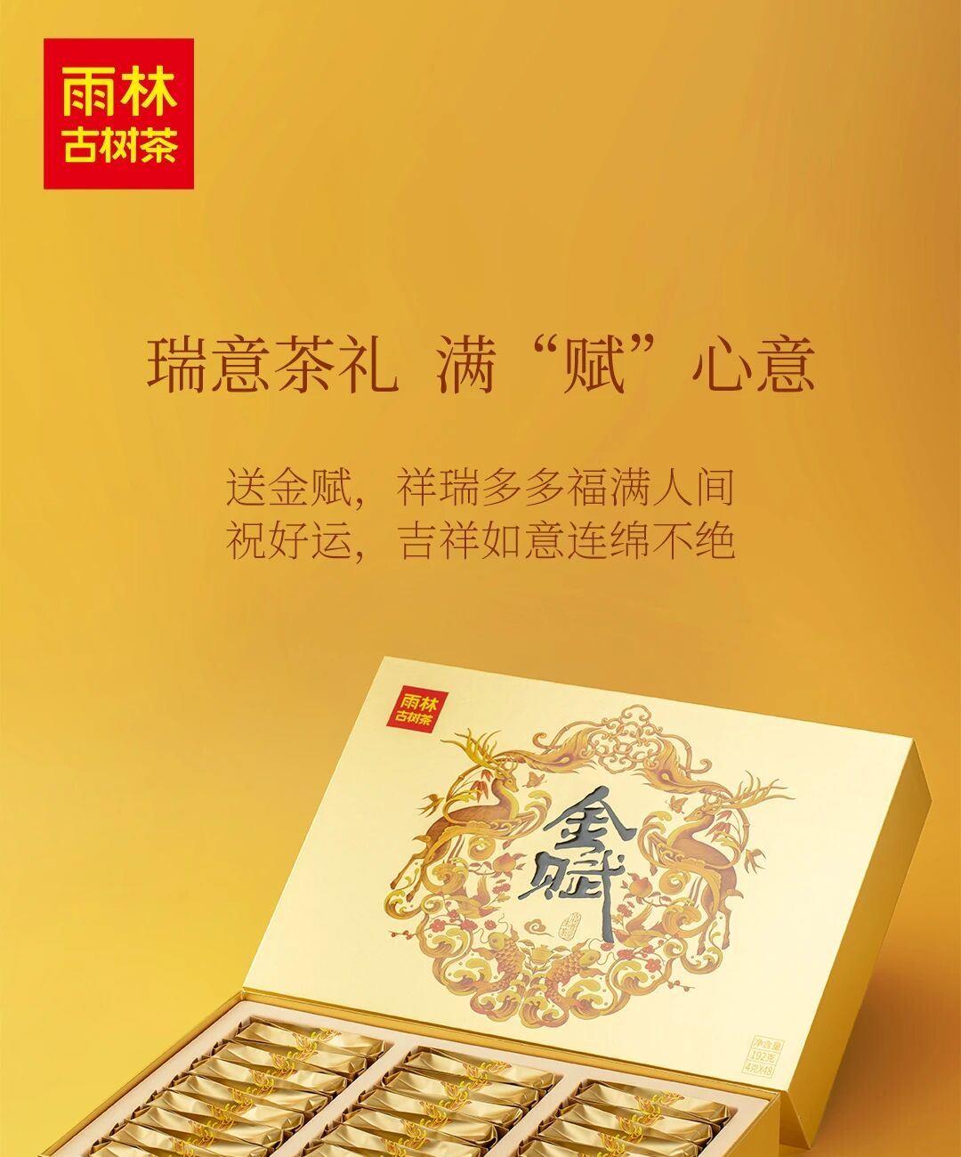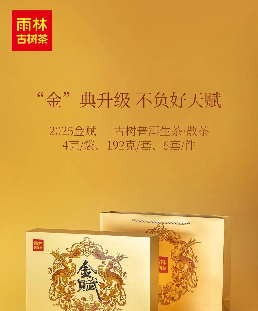 【生产工艺】 (古树普洱茶 · 生茶) 散茶 【规 格】 4克/袋 、48袋/套 【配 料】 云南大叶种古茶树晒青茶(一芽二叶) 【上市年份】 2025年 (生产日期见产品外包装) 推荐理由: “金”典出色, 天赋不凡 。 古树茶一芽二 叶, 丰富内涵锁住甜醇 。 花香蜜韵层次分 明, 成就好滋味的天“赋”法则 。 4克定量装, 给生活加点小“金”喜 。 金赋茶礼, 满“赋 ” 心意 。