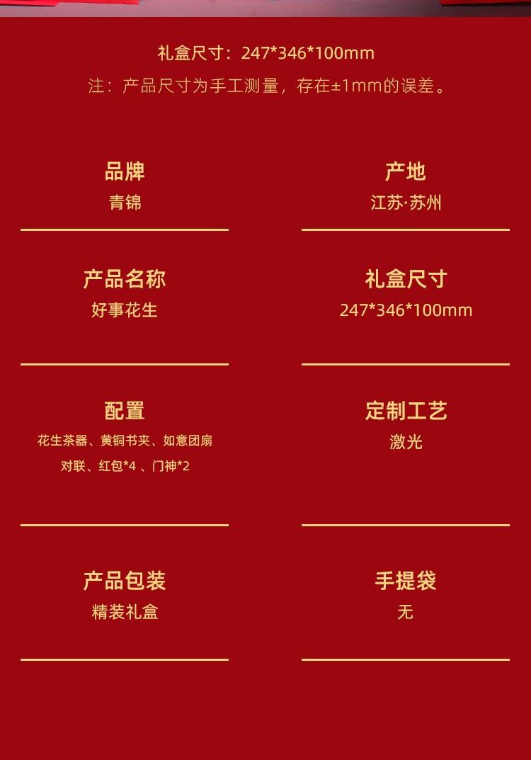花生茶器*1 如意团扇*1 黄铜书夹*1 对联*1-红包*4 门神*2 精装礼盒手提袋*1 花生造型的茶器一壶两杯 创意精致的同时寓意好事发生 搭配精致团扇摆件加洒金艺术纸的红包对联门神年味拉满洒金艺术纸礼盒大气 小预算的精致之选