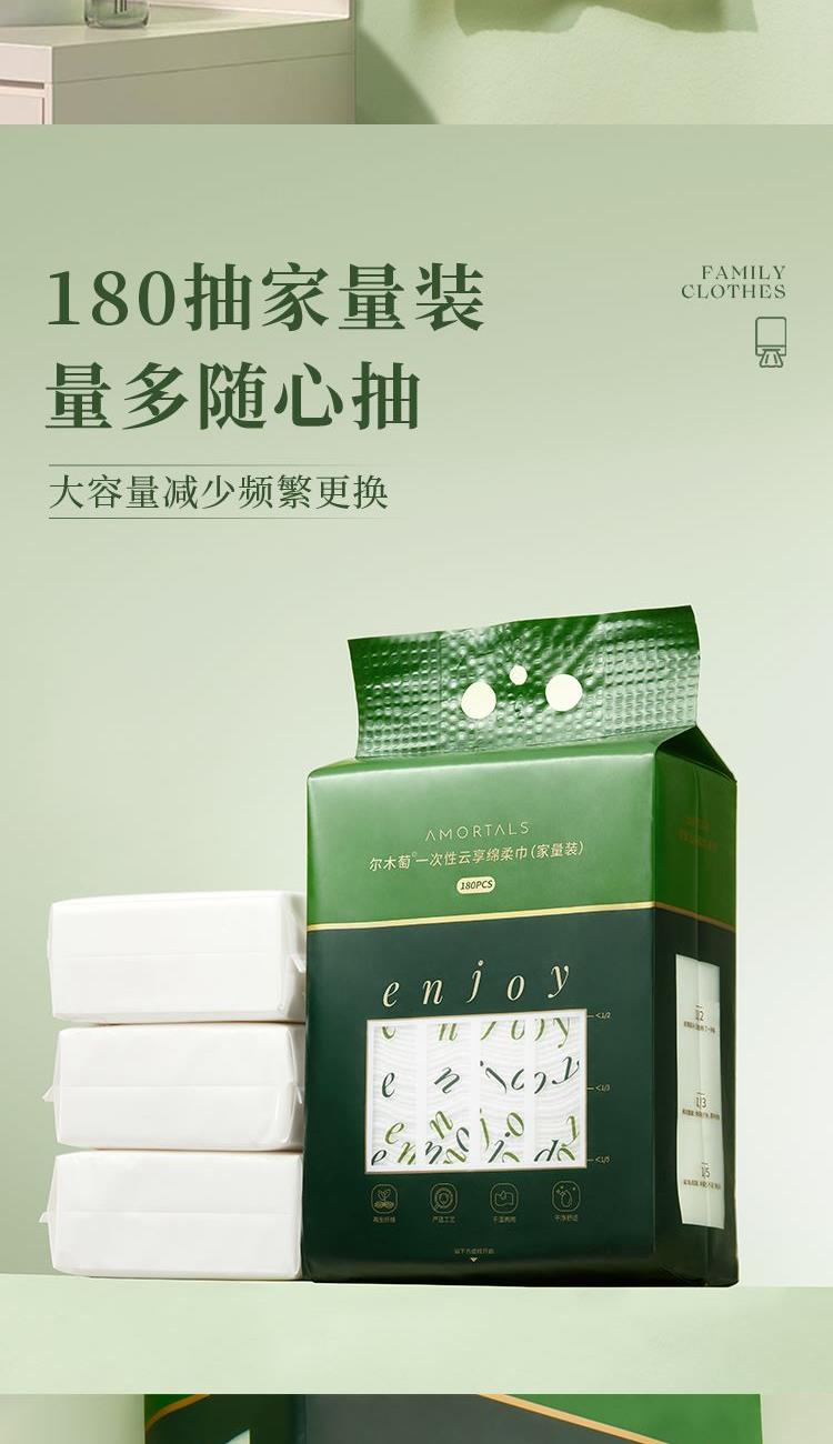 产品:AMORTALS尔木萄一次性云享绵柔巾(家量装) 材质:再生纤维素纤维 规格:20x20cm/片 80g/㎡±3%-5% 纹理:珍珠纹+平纹 净含量:180片/包 净重:600g+20g外包装:37.5x20x10.2cm 厚韧耐用 材质厚度达80-100gsm(普通洗脸巾多为60-70gsm),擦拭时不易破损,适合卸妆、擦洗手台等场景 。 ‌ 180片大容量设计,单包可满足日常使用需求 。 ‌ 悬挂设计省空间 自带挂孔,可直接挂在浴室挂钩或洗手台旁,无需额外支架,节省台面空间 。 ‌ 底部抽取式设计,抽一张不带动其他,避免污染 。 ‌ 干湿两用 适用于面部清洁、卸妆、擦拭家具或餐具等场景,材质绵柔不刺激皮肤 。 ‌ 湿敷时不易掉絮,可重复利用擦拭餐具等 。 ‌