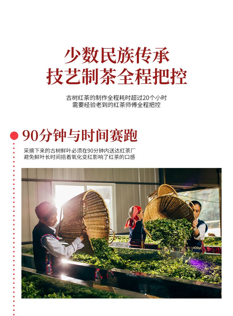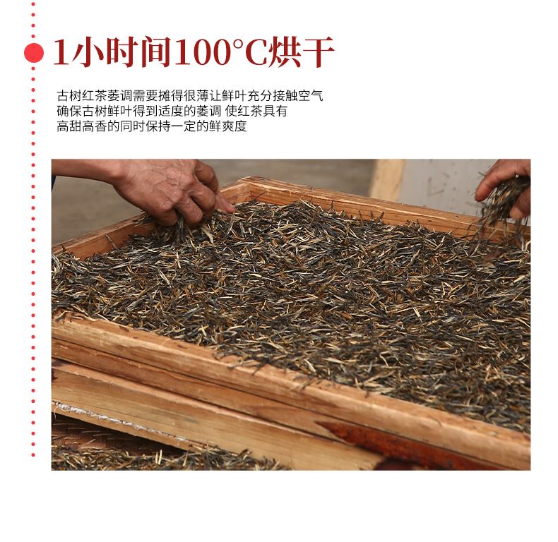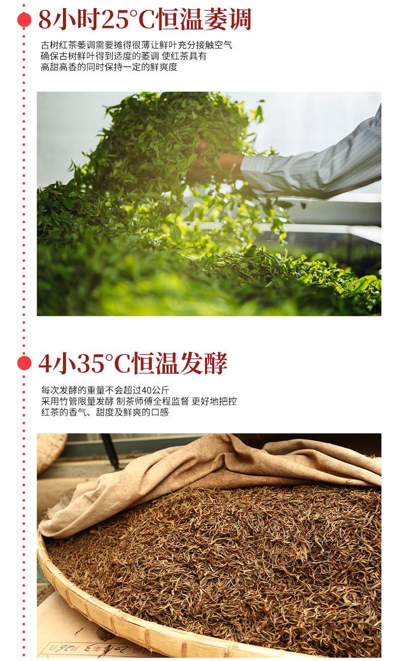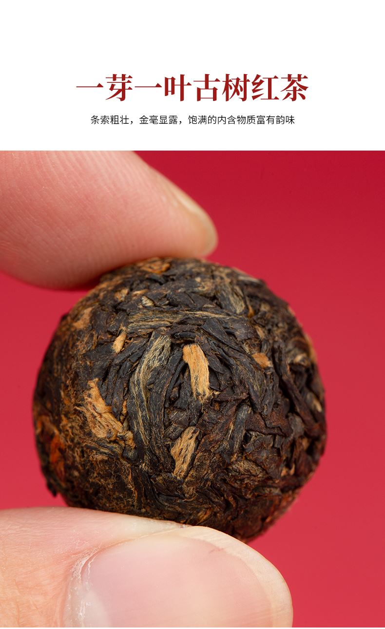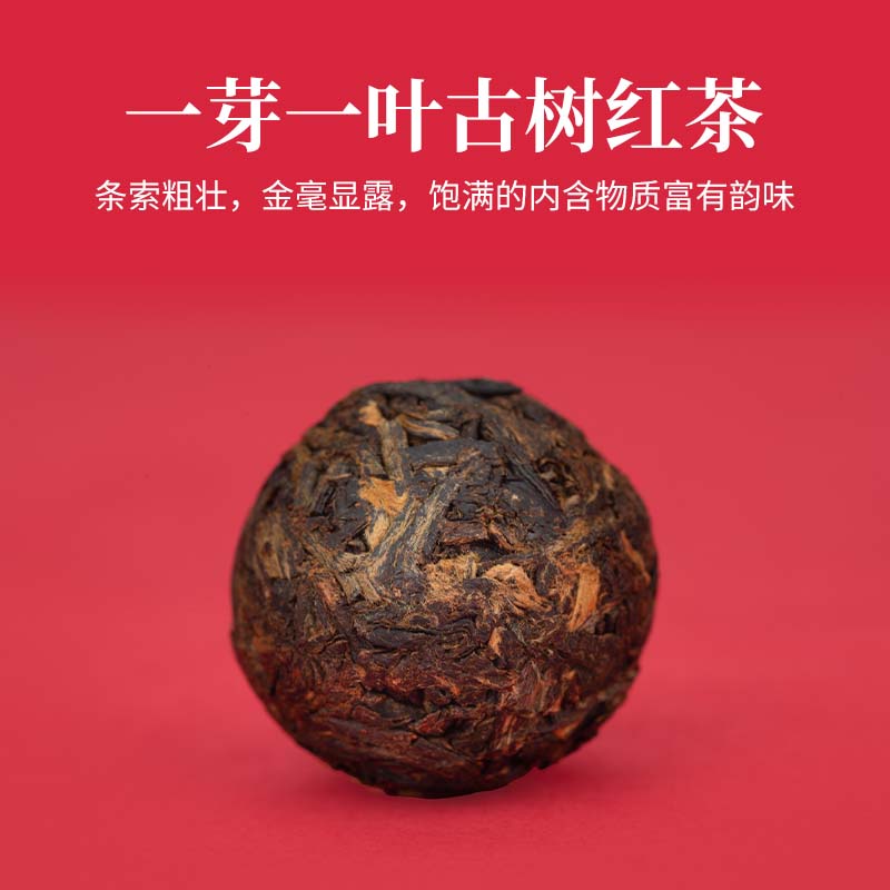 【生产工艺】 古树红茶·沱茶 【规格】 4克/颗 、30颗/罐 【配 料】 云南大叶种古茶树鲜叶 【上市年份】 2023年(生产日期见产品外包装) 推荐理由: 红如夏果初熟, 一饮香甜入喉 。 干茶色泽乌润 、 金毫密布 。 茶汤红黄明亮, 浓醇鲜香, 甜润顺滑 。 香溶于汤, 层次丰 富, 焦糖香 、蜜香 、果香 、 玫瑰香交织呈 现, 芬芳馥郁 。 甜韵十足, 生津回甘明显 。