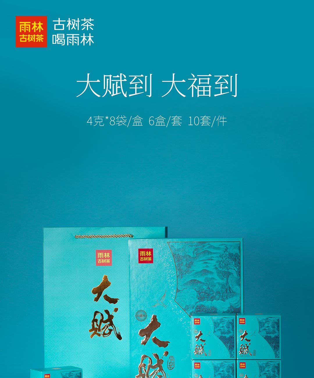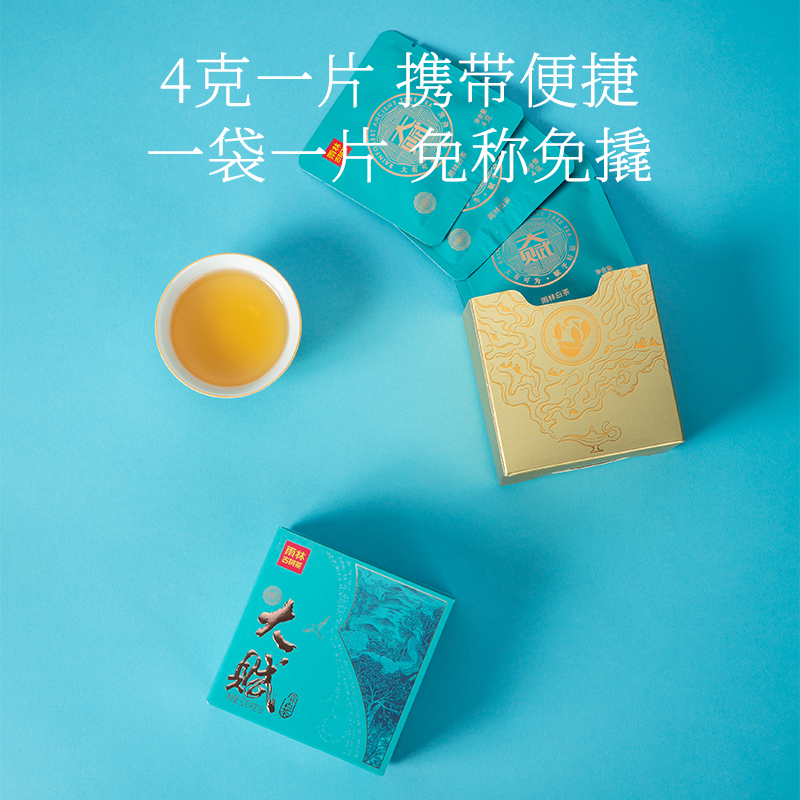 【生产工艺】 (古树白茶) 紧压茶 【规 格】 4克/袋, 8袋/盒, 6盒/套 【配 料】 云南大叶种古茶树鲜叶 【上市年份】 2024年 (生产日期见产品外包装) 推荐理由: 雨林大赋, 天赋之作 。 云南大叶种古树白茶, 高原阳光自然晒制, 释放蜜韵花香 三年干仓陈化, 造就汤色 如金, 口感醇厚, 回味甘甜 。 单片4克便捷 包装, 即泡即享, 轻松品味天赋佳茗 。