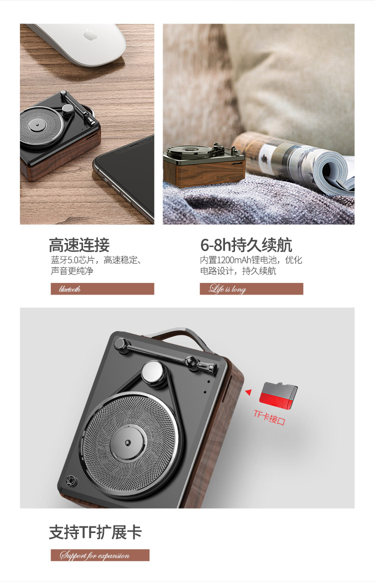 经典复古唱片机蓝牙音响 颜色:木纹色 材质:ABS 尺寸:115*73*64mm 包装:彩盒包装 【功能特点】: 经典复古,岁月留声 经典旋钮控制音量大小 蓝牙连接/插卡播放/USB播放/音频线 5.4蓝牙芯片连接稳定
