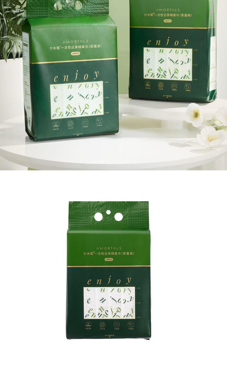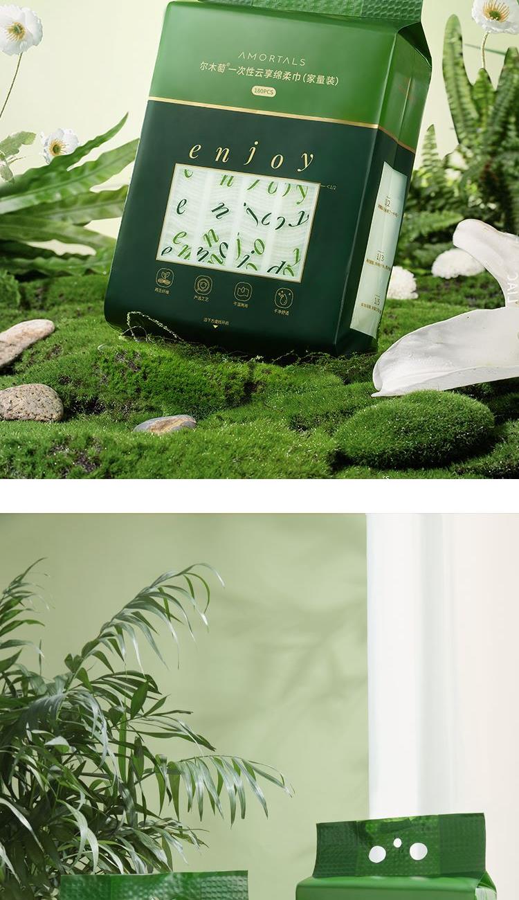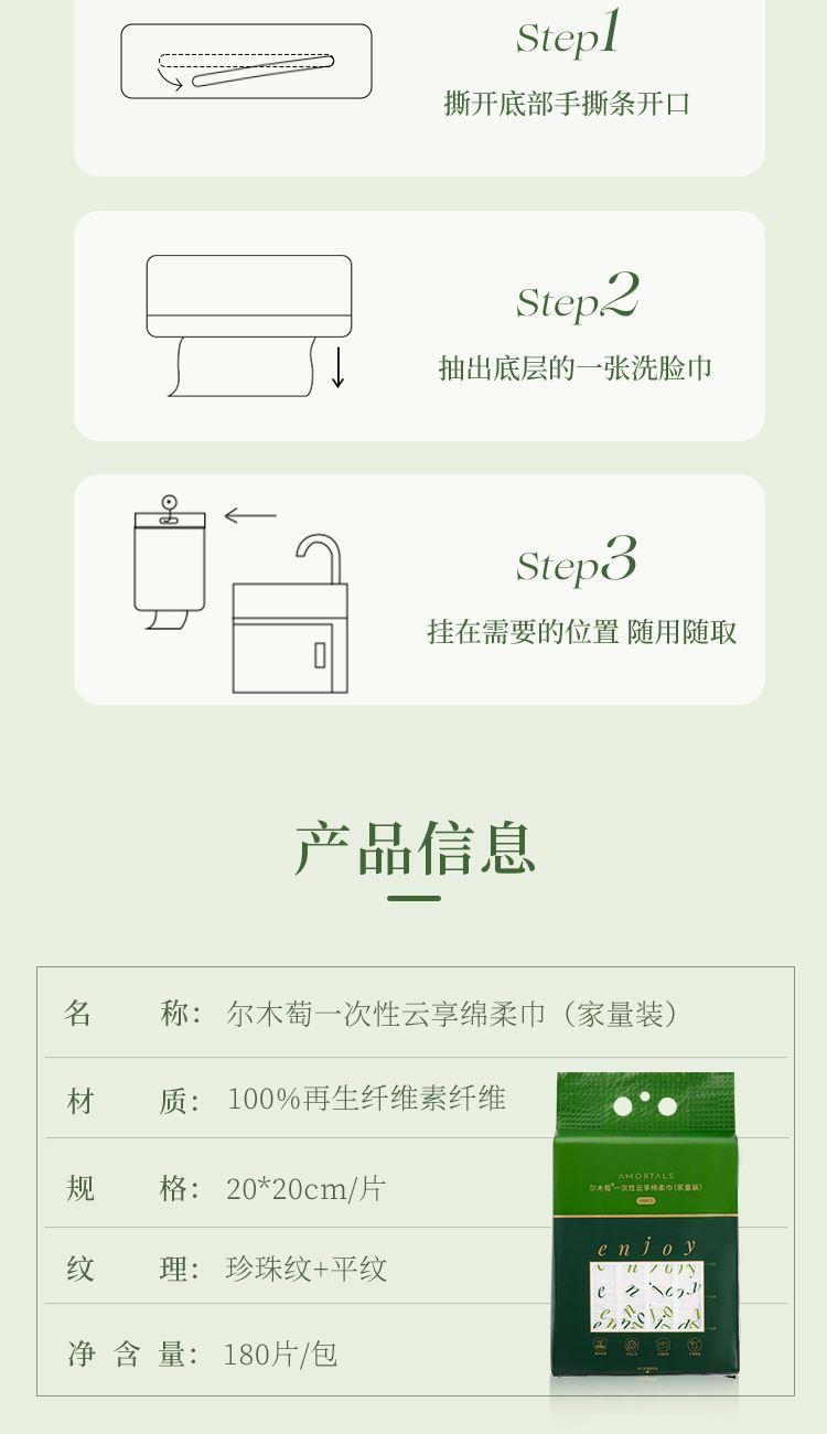 产品:AMORTALS尔木萄一次性云享绵柔巾(家量装) 材质:再生纤维素纤维 规格:20x20cm/片 80g/㎡±3%-5% 纹理:珍珠纹+平纹 净含量:180片/包*2包 净重:600g+20g外包装:37.5x20x10.2cm "厚韧耐用 材质厚度达80-100gsm(普通洗脸巾多为60-70gsm),擦拭时不易破损,适合卸妆、擦洗手台等场景 。 ‌ 180片大容量设计,单包可满足日常使用需求 。 ‌ 悬挂设计省空间 自带挂孔,可直接挂在浴室挂钩或洗手台旁,无需额外支架,节省台面空间 。 ‌ 底部抽取式设计,抽一张不带动其他,避免污染 。 ‌ 干湿两用 适用于面部清洁、卸妆、擦拭家具或餐具等场景,材质绵柔不刺激皮肤 。 ‌ 湿敷时不易掉絮,可重复利用擦拭餐具等 。 ‌ 性价比高 低于同类产品 。