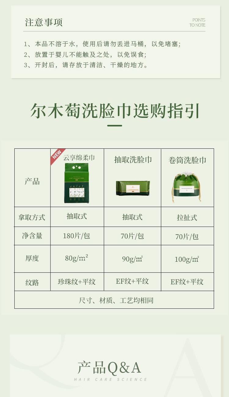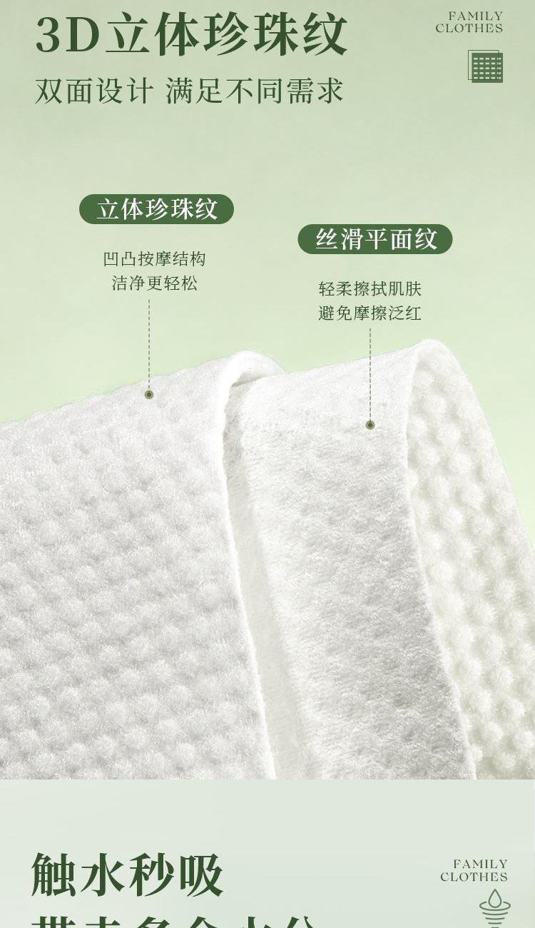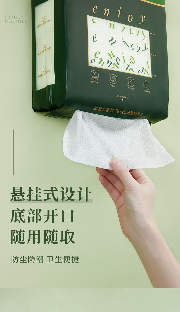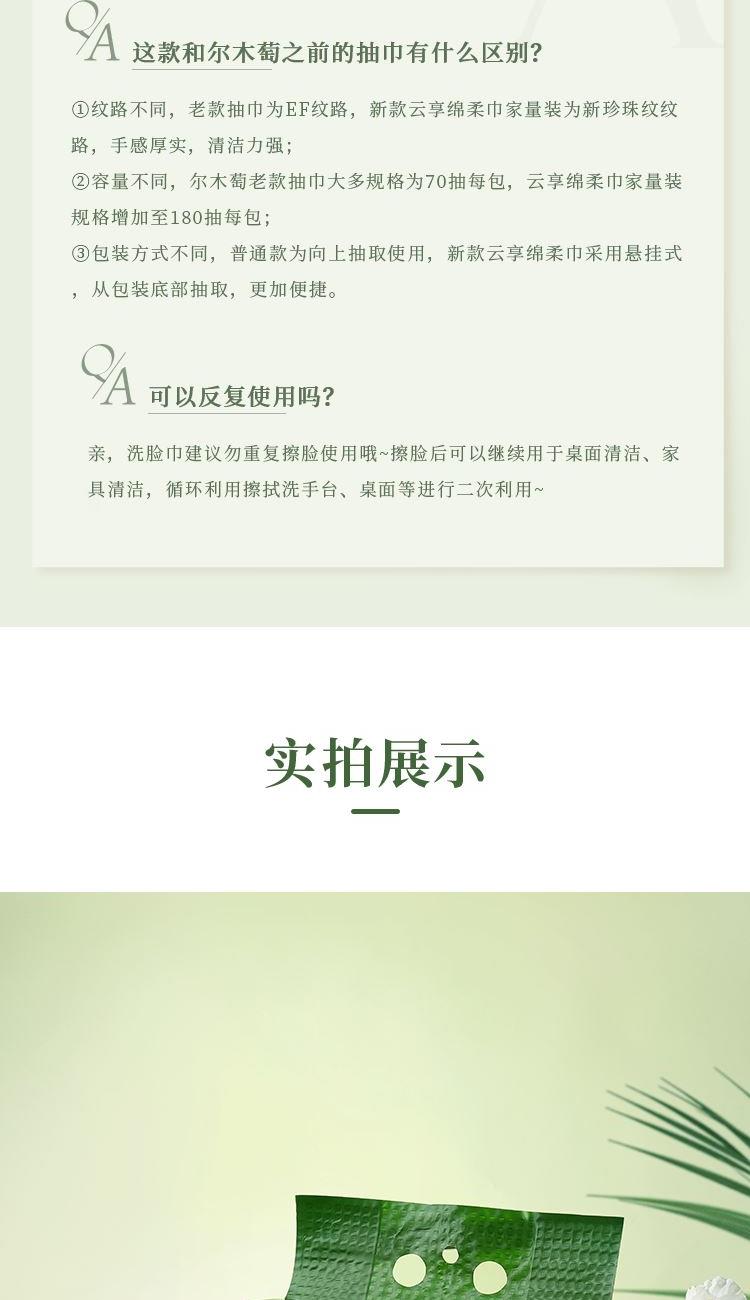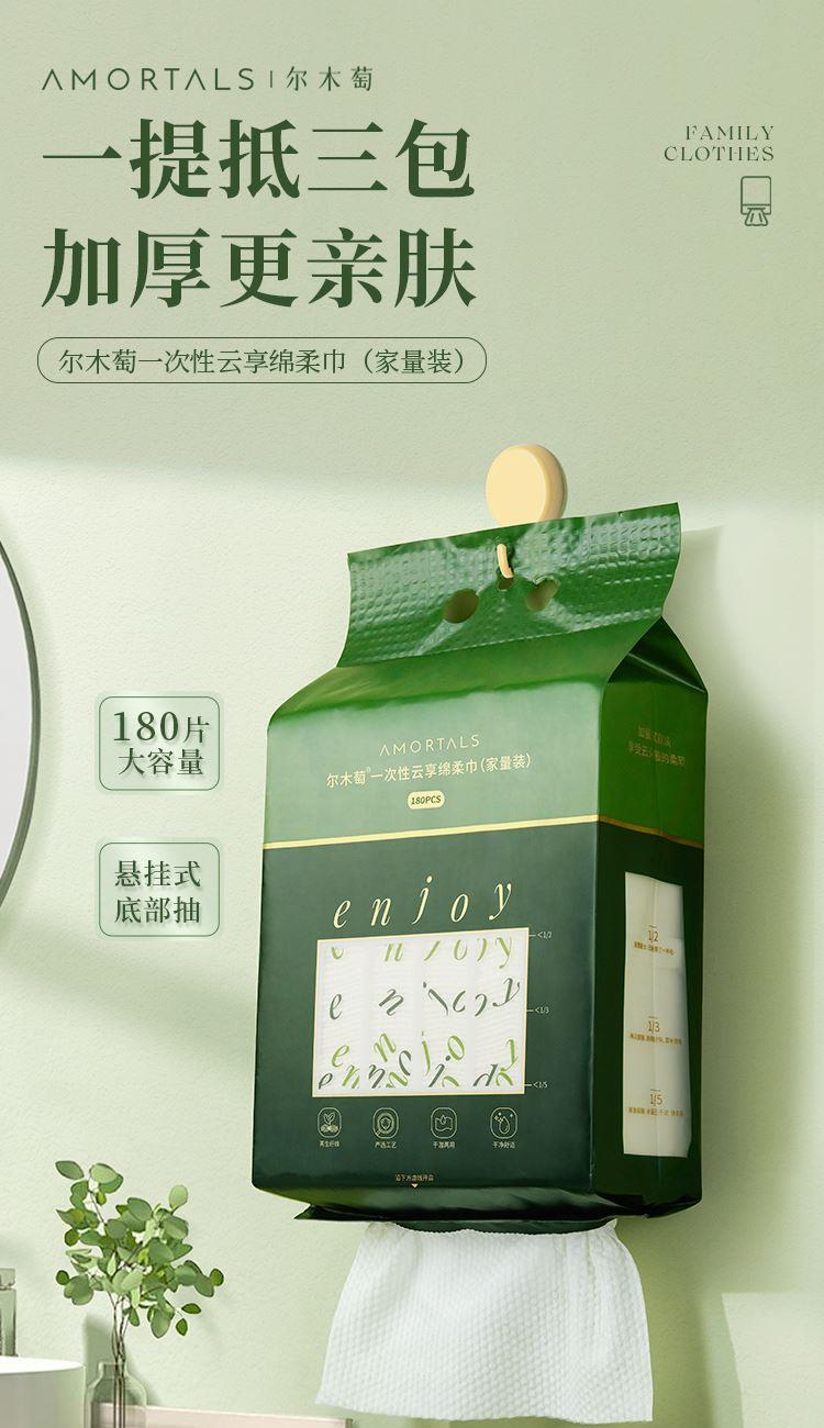 产品:AMORTALS尔木萄一次性云享绵柔巾(家量装) 材质:再生纤维素纤维 规格:20x20cm/片 80g/㎡±3%-5% 纹理:珍珠纹+平纹 净含量:180片/包 净重:600g+20g外包装:37.5x20x10.2cm 厚韧耐用 材质厚度达80-100gsm(普通洗脸巾多为60-70gsm),擦拭时不易破损,适合卸妆、擦洗手台等场景 。 ‌ 180片大容量设计,单包可满足日常使用需求 。 ‌ 悬挂设计省空间 自带挂孔,可直接挂在浴室挂钩或洗手台旁,无需额外支架,节省台面空间 。 ‌ 底部抽取式设计,抽一张不带动其他,避免污染 。 ‌ 干湿两用 适用于面部清洁、卸妆、擦拭家具或餐具等场景,材质绵柔不刺激皮肤 。 ‌ 湿敷时不易掉絮,可重复利用擦拭餐具等 。 ‌ 性价比高 低于同类产品 。
