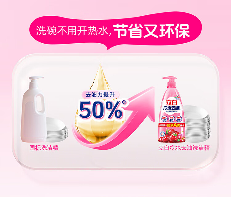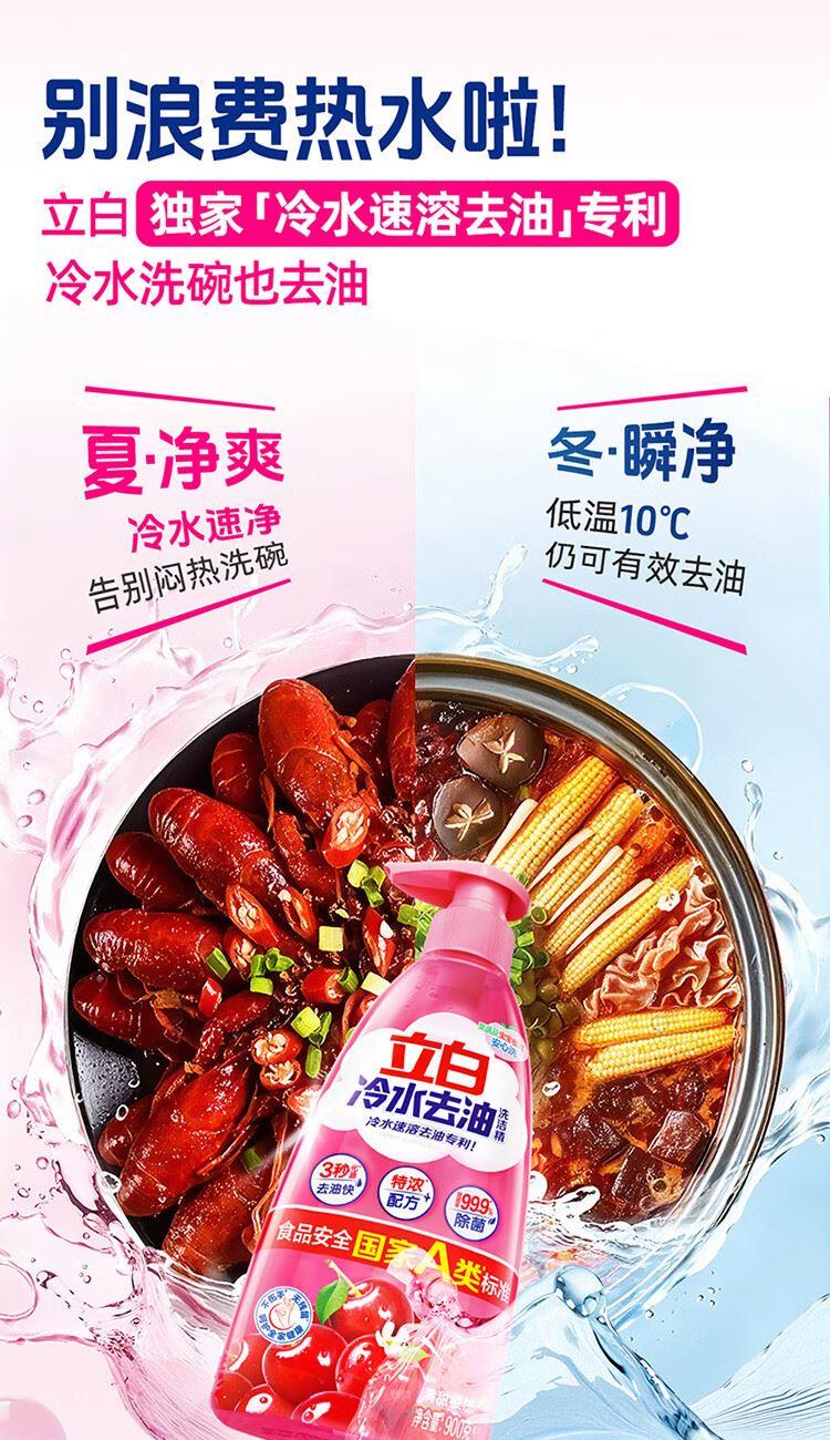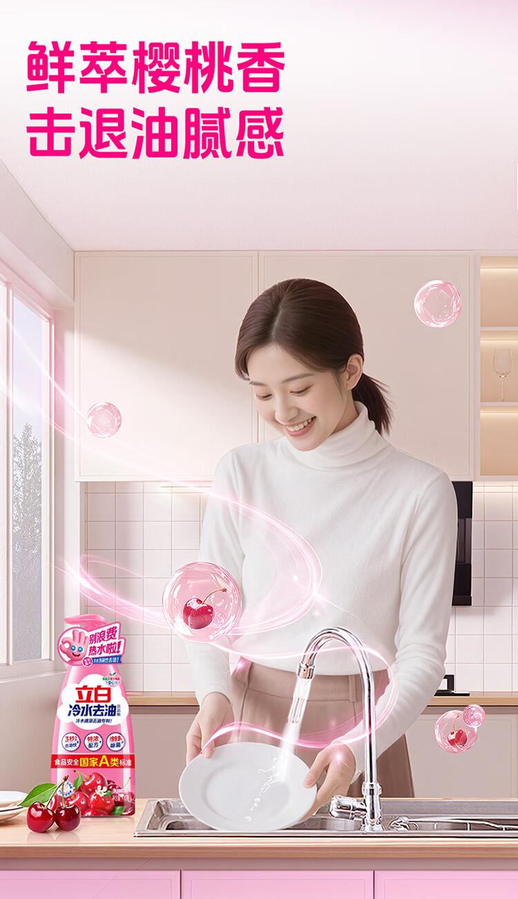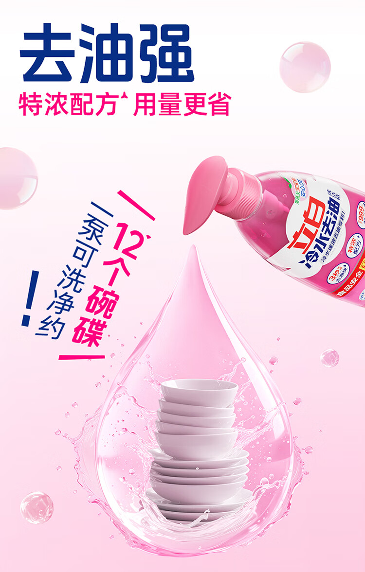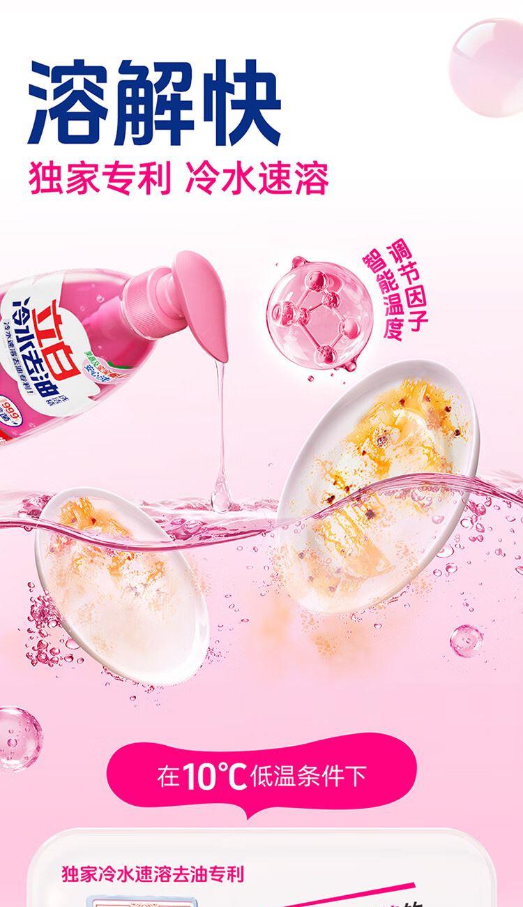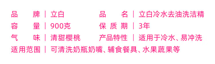 产品成分: 水、维生素E、樱桃提取物、脂肪酶、天然表面活性剂、C6-10脂肪醇聚氧乙烯聚氧丙烯醚、C10-16烷基苯磺酸钠、食用香精、助剂、甲基异噻唑啉酮、甲基氯异噻唑啉酮。 产品功效: 冷水速溶去油 冷水洗碗也去油