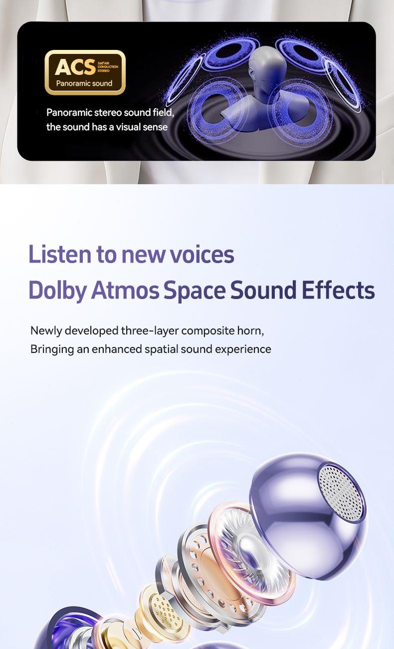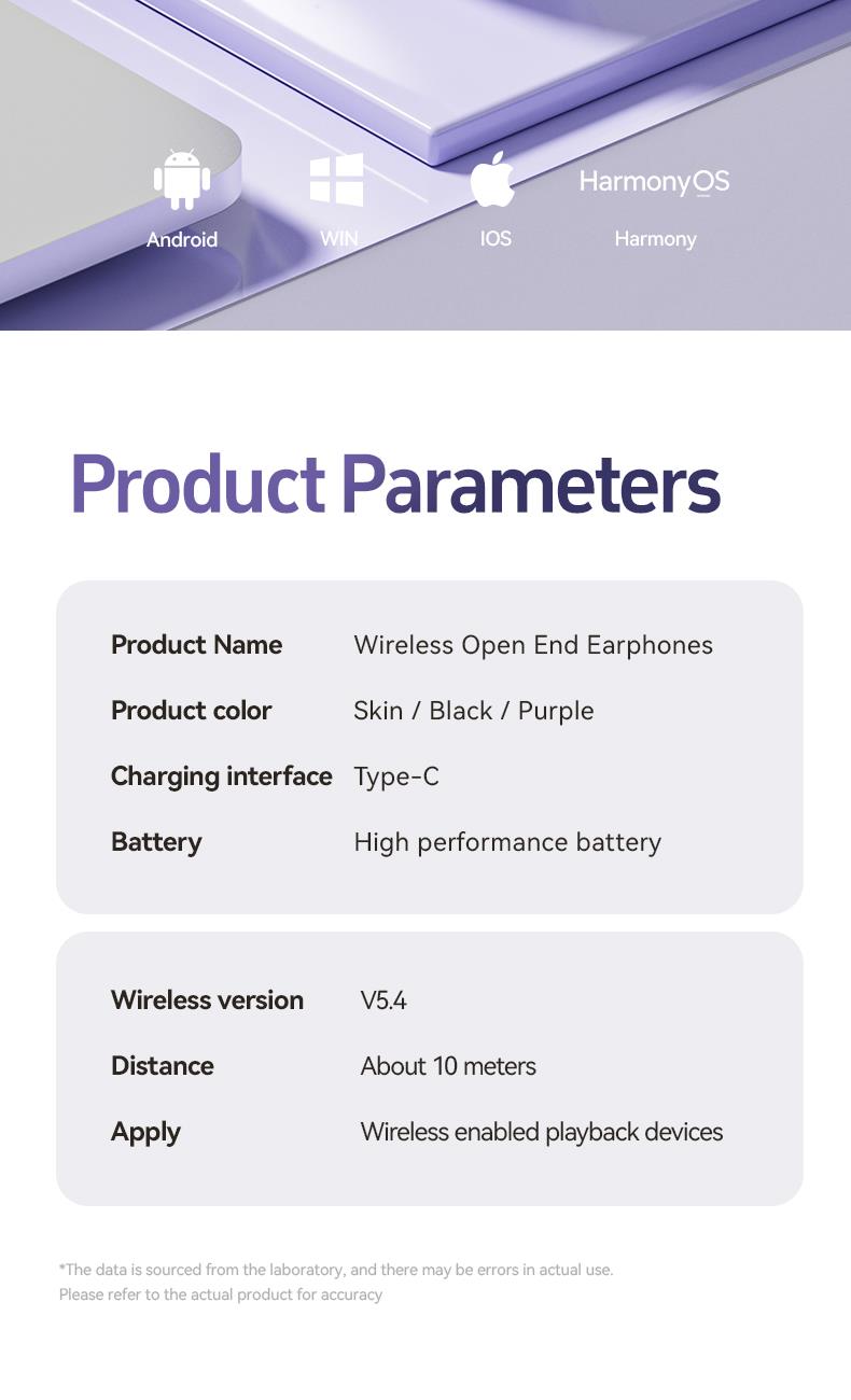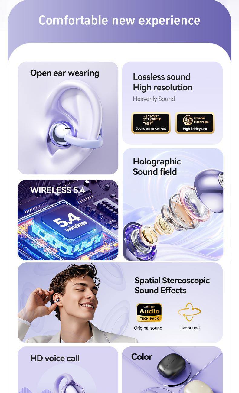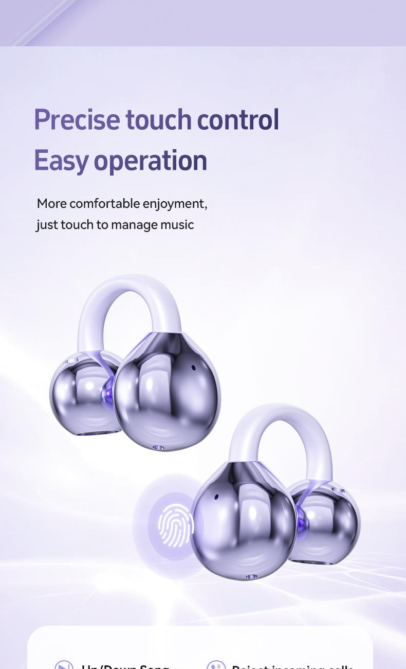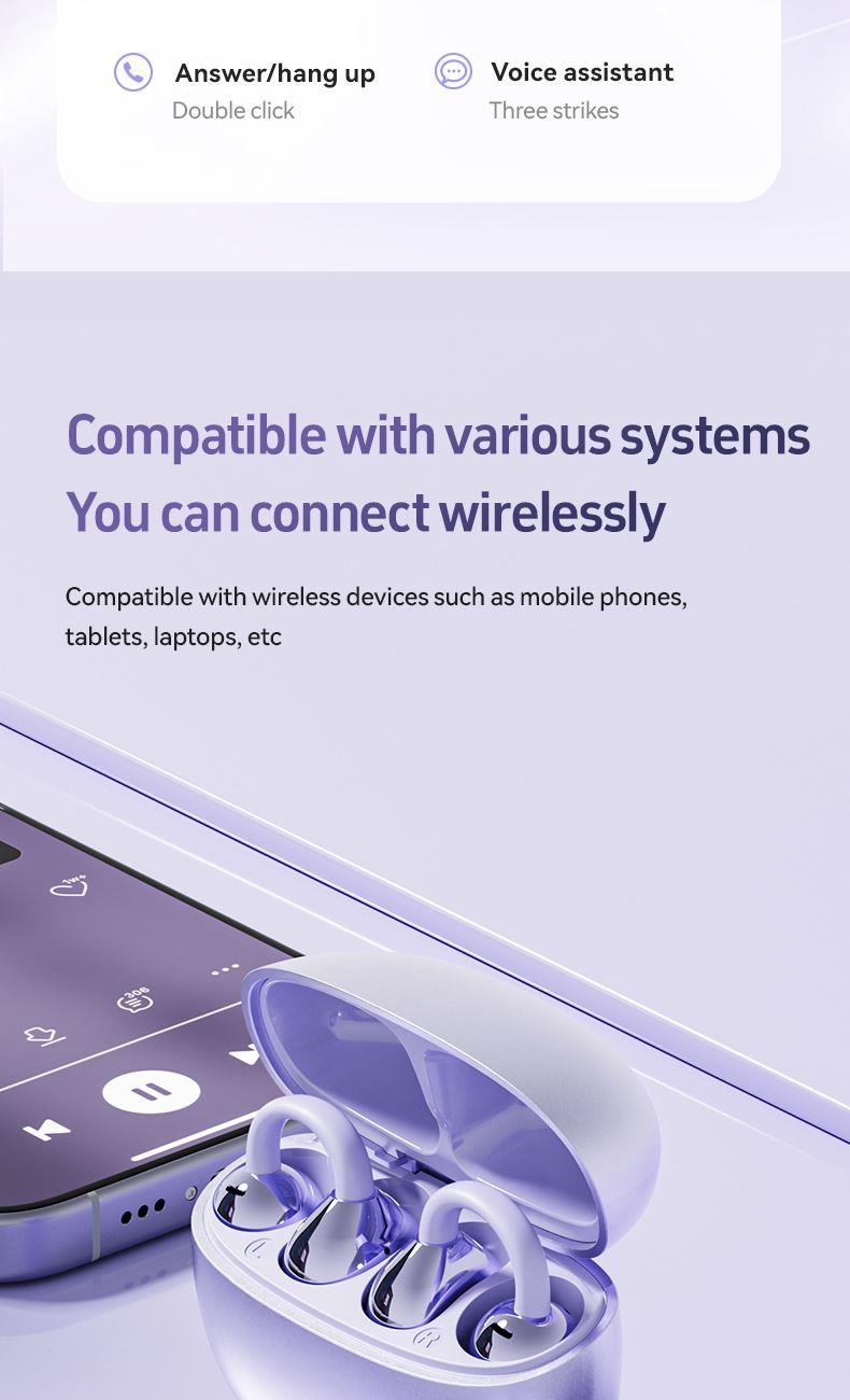 时尚电镀喷漆耳夹式耳机 型 号: M108 产品颜色:肤色、紫色、灰色 带包装重量:90.5g 外箱尺寸:158.5*37*20.5CM 整箱数量:100 PCS 整箱重量:10.5 KG 耳机尺寸:2.8*2.5*1.8CM 单耳重量:4.1g机仓尺寸:6.2*5*2.6CM 彩盒尺寸:11.5*9.2*3.6cm 裸机重量:43.59 【功能特点】: 方案:蓝讯5656C3蓝牙版本:V5.4支持协议:A2DP,AVRCP,HFP传输距离:10米 耳机电池:30毫安 401012 机仓电池:701230-230毫安 (带保护板)喇叭尺寸:F10钛合膜喇叭