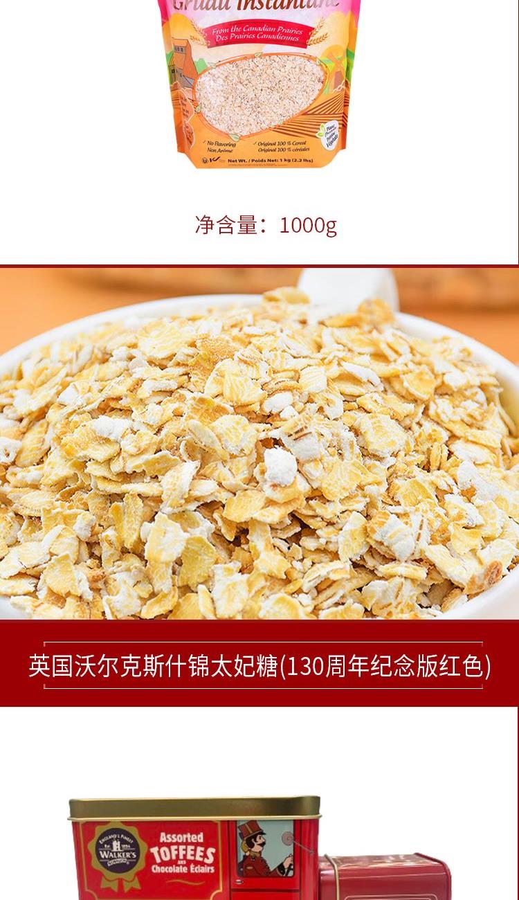 英国沃尔克斯什锦太妃糖(130周年纪念版红色)158g 瑞士三角牛奶巧克力(含蜂蜜及巴旦木糖)100g 意大利维趣多可可榛子味饼干225g 印尼皇冠丹麦曲奇饼干163g盒装 越南茜贡小姐综合蔬果干200g 马来西亚滴朵原味白咖啡90g 马来西亚滴朵蓝山风味咖啡90g 越南进口丹帝即食燕麦片1000g 名物精美包装盒:360*360*190mm