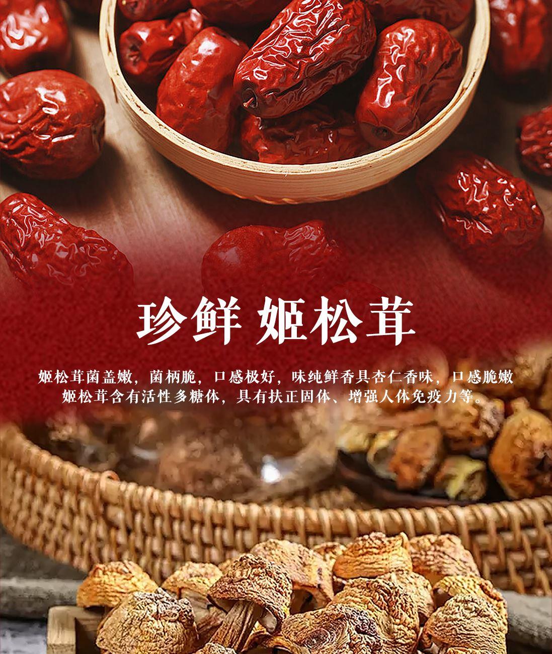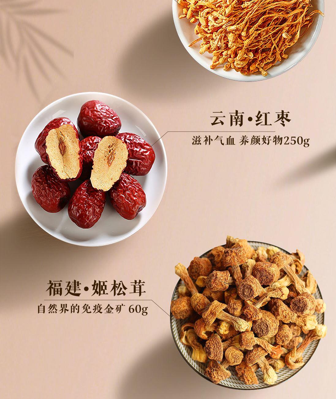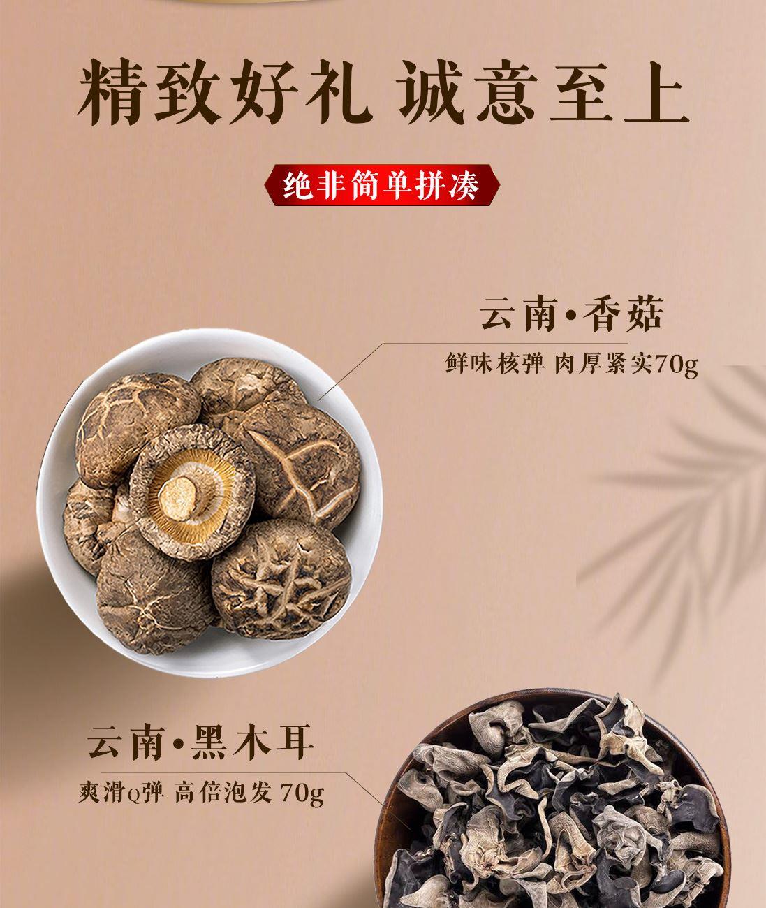 配置:姬松茸60g、香菇70g、黑木耳70g、鹿茸菇68g、虫草花70g、红枣250g、养生汤包60g 商品规格:648g/盒 产品尺寸:350*300*130mm 保质期:12个月 京东自营旗舰店销量好评1w+,源头工厂,支持项目授权,项目保护。