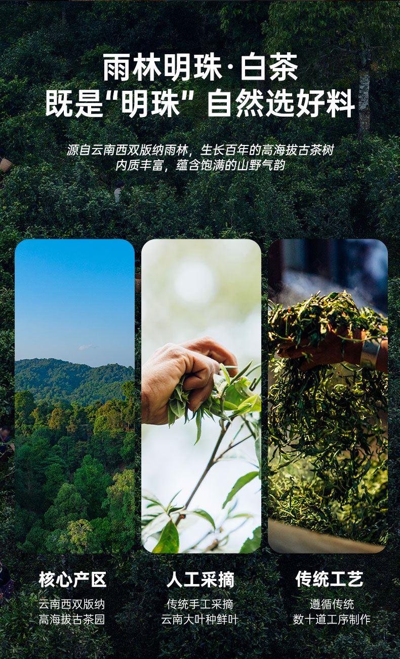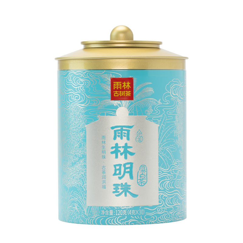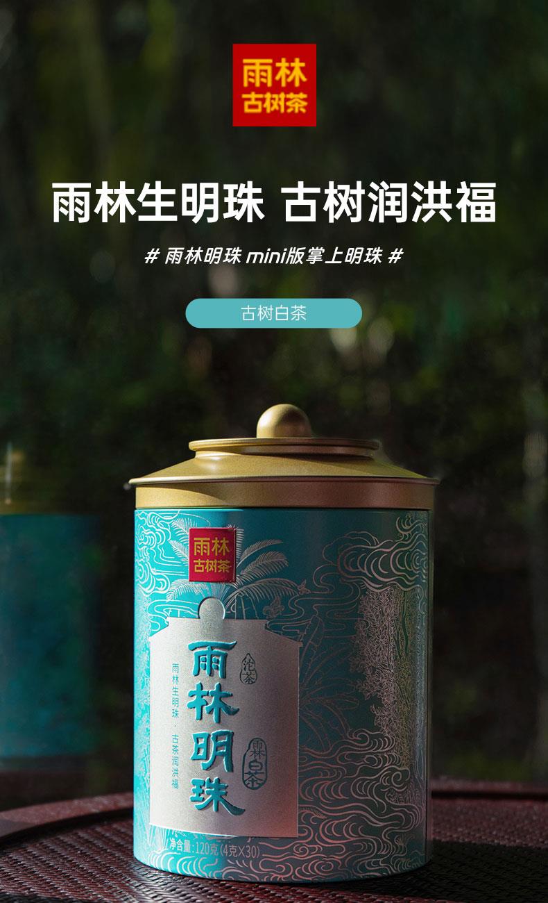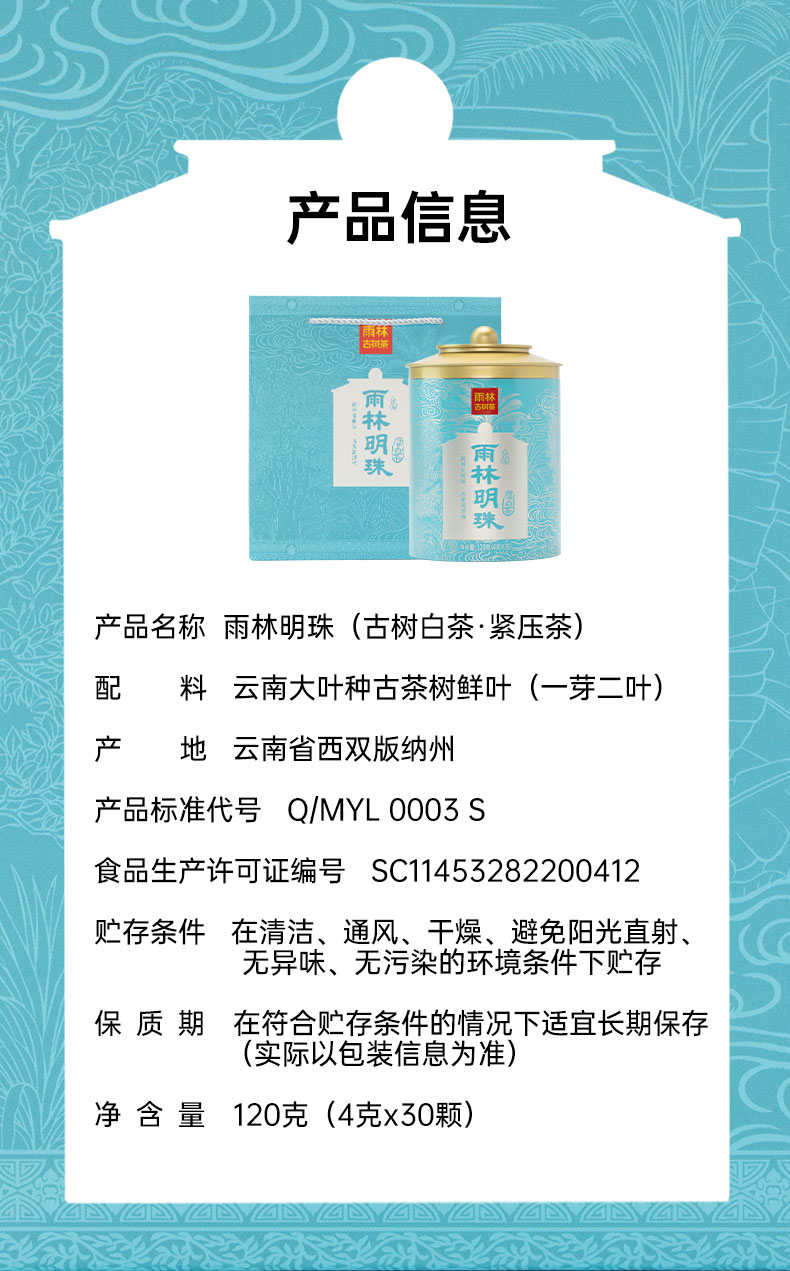【生产工艺】 雨林白茶·紧压茶 【规格】 4克/沱 120克/罐 【配料】 云南大叶种古茶树鲜叶( 一 芽二叶) 【上市年份】 2024年 (生产日期见产品外包装) 推荐理由: 雨林明珠, 古茶润福 。 雨林明珠·白茶, 入口香甜, 毫香显露, 如逢雨后初霁的花 园 。 独立4克小沱装, 便携易泡, 是自饮或 分享的不二之选 。 活泼蓝罐, 让储存更简 单 。