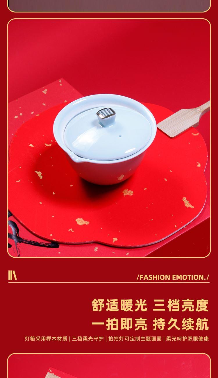拍拍主题夜灯(可定制画面)*1伯仲之叙茶器一壶*1 单杯*2寿眉白茶*4包对联*1-红包*4 门神*2 如意团扇*1枚精装礼盒手提袋*1 伯仲之叙一壶两杯影青釉色淡雅精致 拍拍夜灯一拍变色三色光源可以定制灯面内容 一套起订免费定制快速 发货